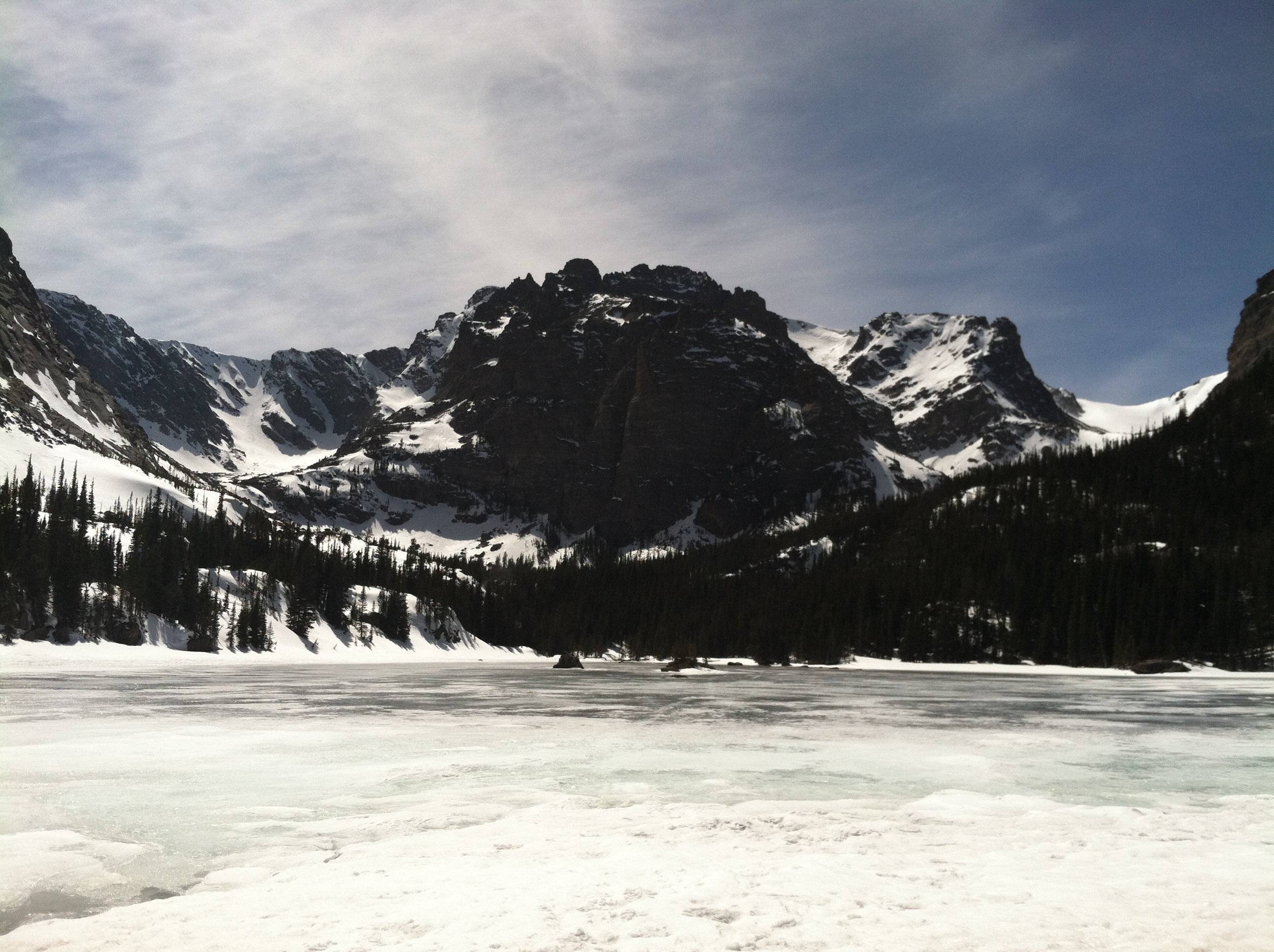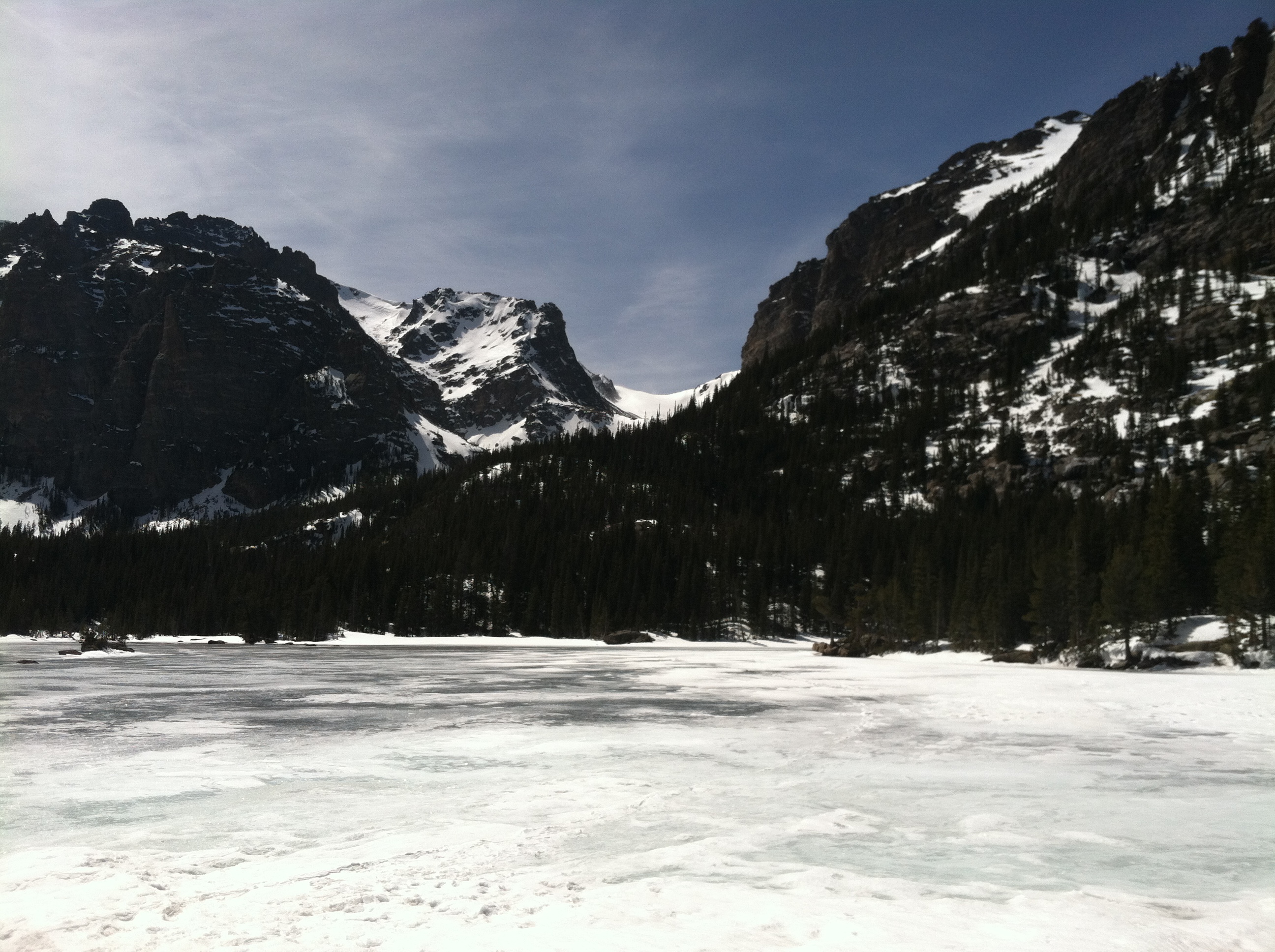 So I decided to get a hike in before work possibly fills my schedule. I trudged through both soft and icy snow in order to see a panoply called Mills Lake in Rocky Mountain National Park. I saw five people on the trail and three of them turned around because every twentieth step would plunge you knee deep in snow. I had Yak Trax (chains that slide on my boots) and two walking sticks made for petite hikers which were waiting for me at the trailhead and I felt like Mills Lake had to be seen. I read that it’s the prettiest lake in the park. So I trudged on with a big smile and a lot of layers.