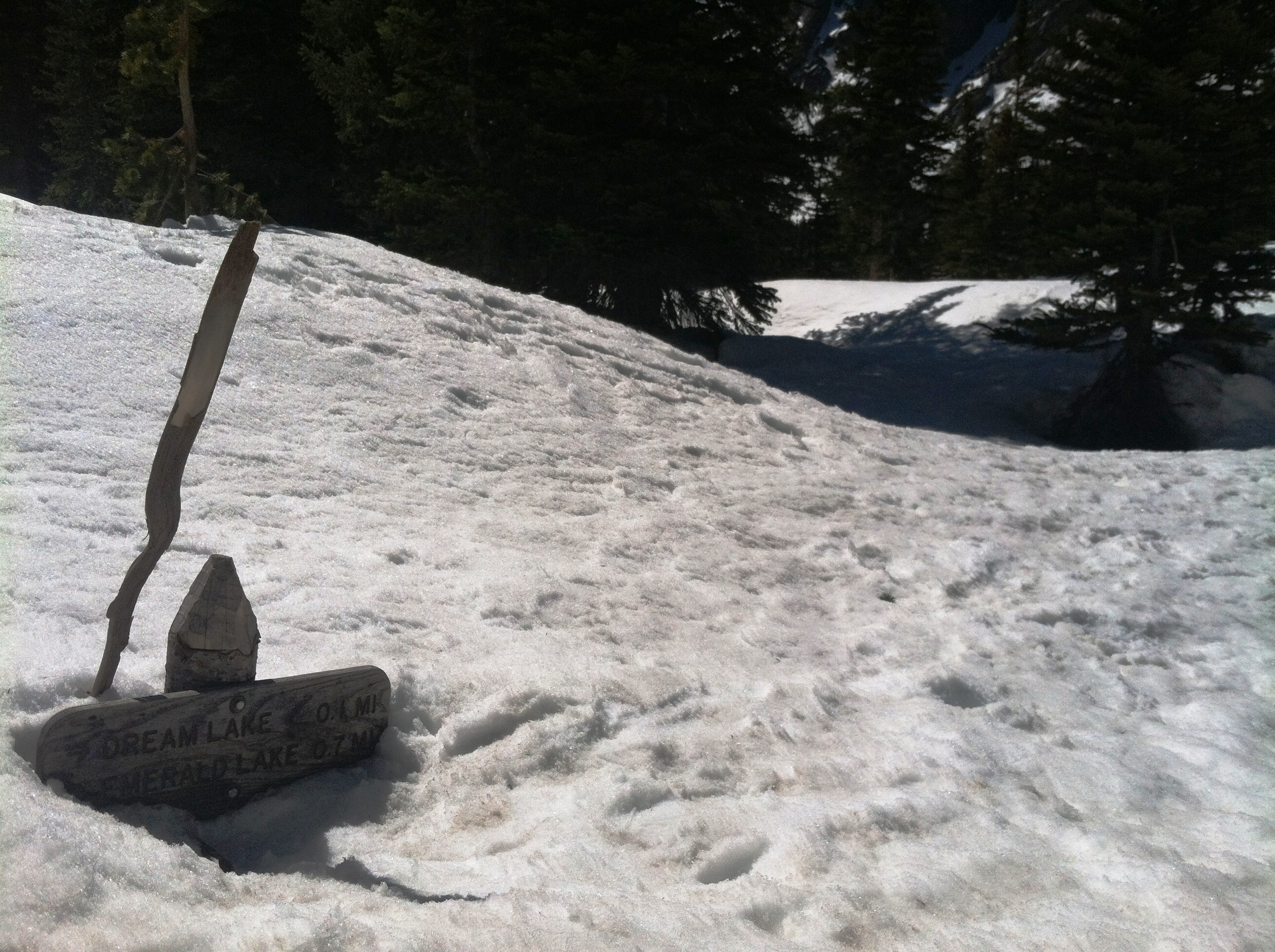 As I rounded the snowy corner and saw the mountains dramatically framing half frozen Dream Lake, I gasped. Then I laughed and said, “Wow” under my breath. Dream Lake is just that, an absolute dream. I found a rock in the sunshine and ate a hardboiled egg while I watched the fish swim near me. I looked up when I heard voices and gasped again when I saw two guys walking across the half frozen lake. I’m sure on their side, it was very frozen, but like I said, I was just watching fish swim on my side. I was having such a peaceful lunch until I kept thinking I was going to have to go all It’s a Wonderful Life on them and I would never hear from out of my left ear again.