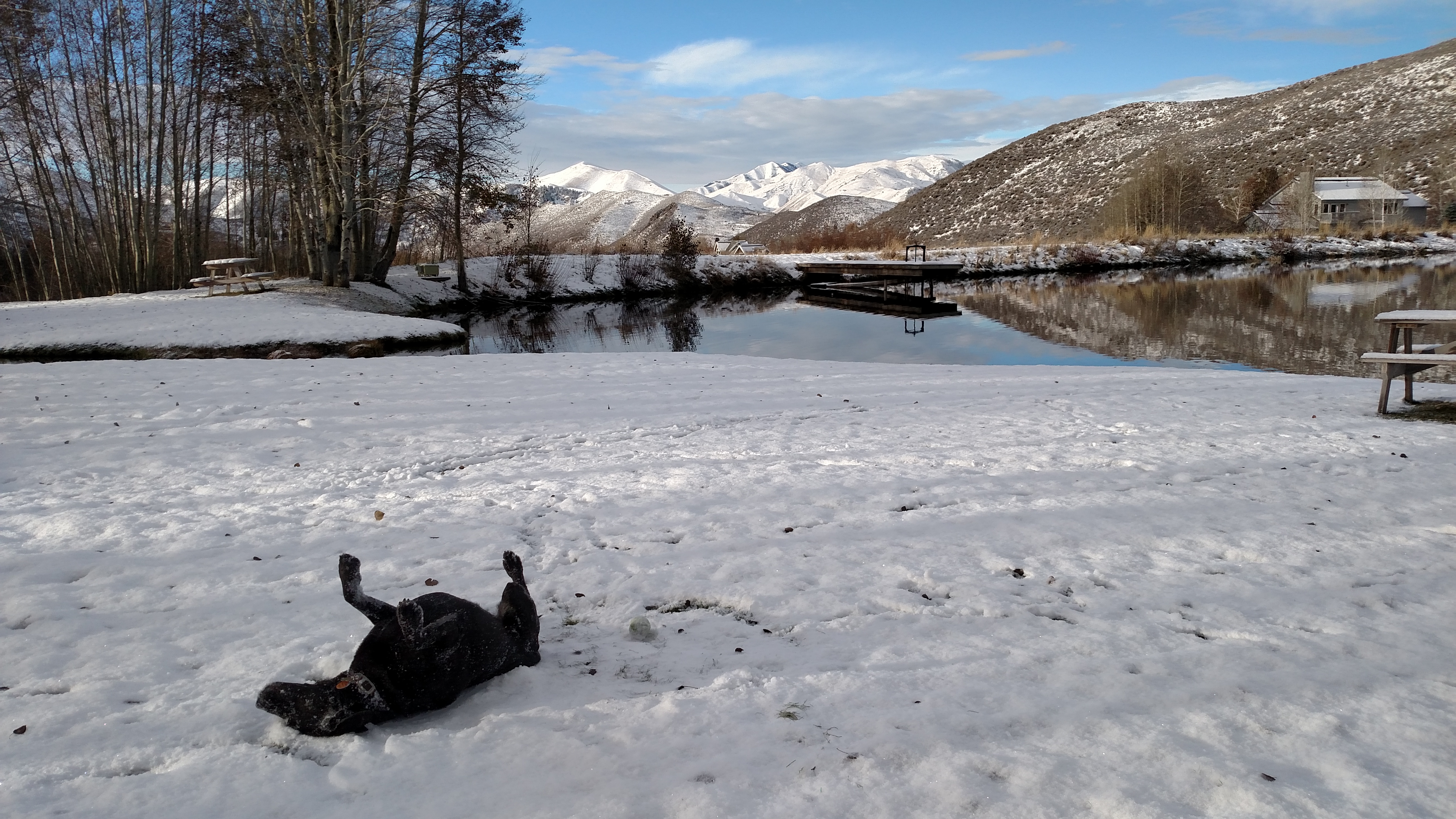 She seems to understand that if she waits for me to get coffee brewing, we’ll go outside shortly after and throw the ball over and over. She nose dives into the snow to find the ball and it makes me laugh every time, her face covered in flakes. I swear she smiles. Sometimes it seems she gets so overwhelmed with joy that she flips on her back and rolls around in the snow, digging her nose into it and smiling more.
